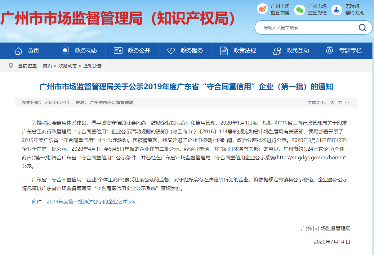 近日,广州市市场监督管理局对2019年度广东省“守合同重信用”企业进行公示,我司凭借着重信守约的行为准则,健全的合同管理体系,诚信经营,规范管理,顺利通过了最终评审,成功获得了广东省“守合同重信用”企业证书。